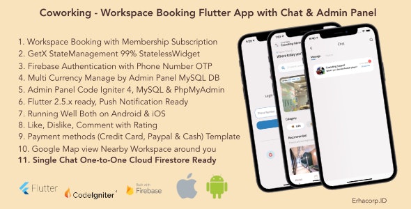 Coworking – Workspace Booking Flutter Full Application with Chat & Admin Panel. Workspace Booking instantly. Multi language support, multi currency support. Membership subscription per month ready. Payment Credit Card, Paypal & Cash Template. Flutter v. 2.5.x Ready.