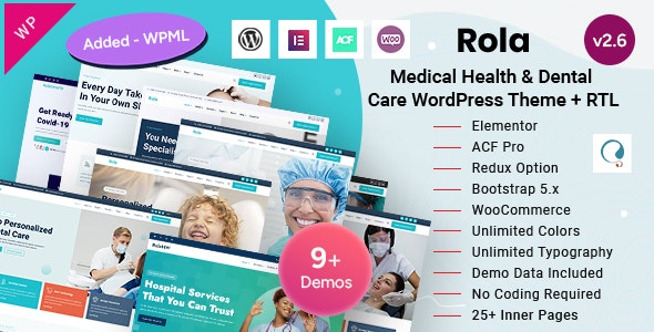 Rola is a Creative and Beautifully crafted modern Responsive WordPress Theme built for Medical, Hospital, Dentist & Dental Clinic website. The theme suits for dental practices, doctor’s clinics, hospitals, doctor’s consultation centers, cosmetic surgery centers, medical laboratories, dental clinics, centenary clinics, pharmacies, etc. The theme has multiple demo variations with blogs and inner pages. It is developed with Elementor, ACF Pro, Redux, Bootstrap, and Sass.